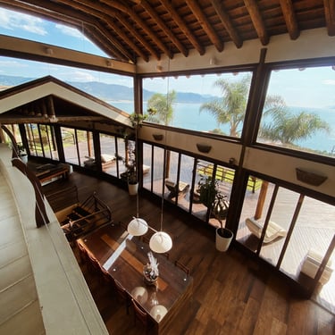 A mansão conta com ambientes amplos com vista panorâmica, piscina de borda infinita,